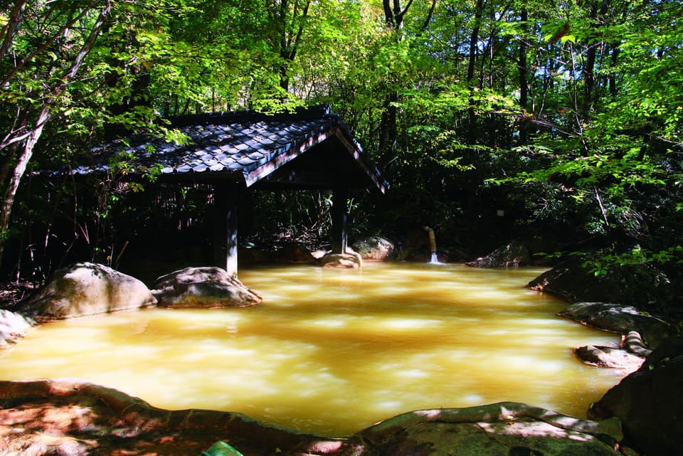 別荘から続く小道を進むと姿を現す湯船は、開放感がありながらも、周囲を木々が囲む隠れ家のような雰囲気。無色透明のお湯は、気候条件によって年に数回だけ青みを帯びた乳白色に変化をするそう。こんこんと湧き立つ湯量豊富な温泉に身を沈めると、大らかな湖に抱かれているかのような安らぎを覚えます。