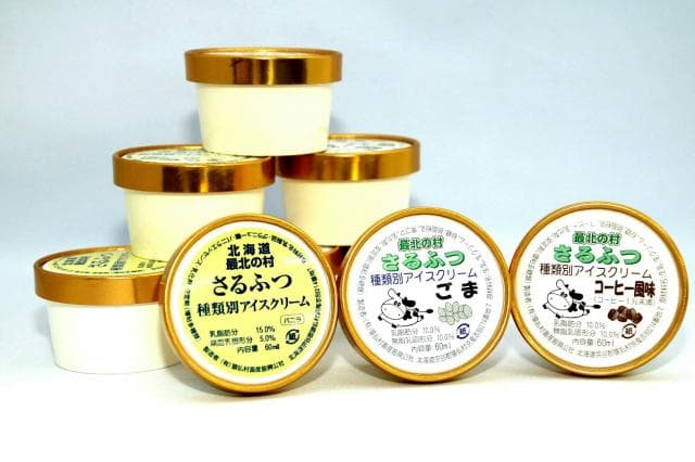 味は バニラ・コーヒー風味・ごま の3種類。さるふつ牛乳を使用し、舌触りなめらかなアイスクリームです。