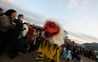「鵺」とは、頭が猿、胴体が虎、尾が蛇、ヒョーヒョーという気味悪い声をあげながら黒煙とともに現れる妖怪。「鵺ばらい祭」は、このおそろしい鵺を、あやめ御前の夫・源三位頼政が退治したという故事にちなんだお祭です。地元中学生がこの日のために練習を重ねた鵺踊りの披露や、福を呼ぶ餅まきなどを行います。