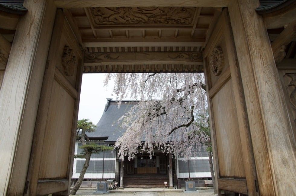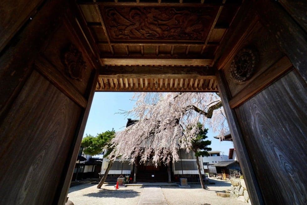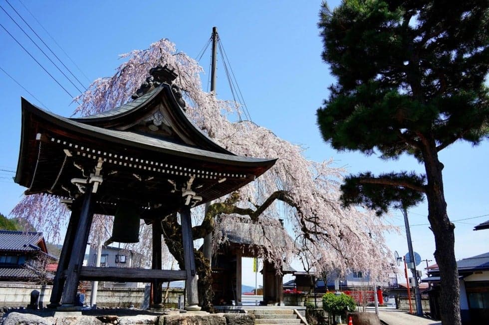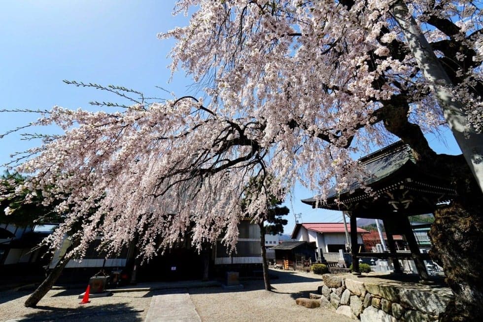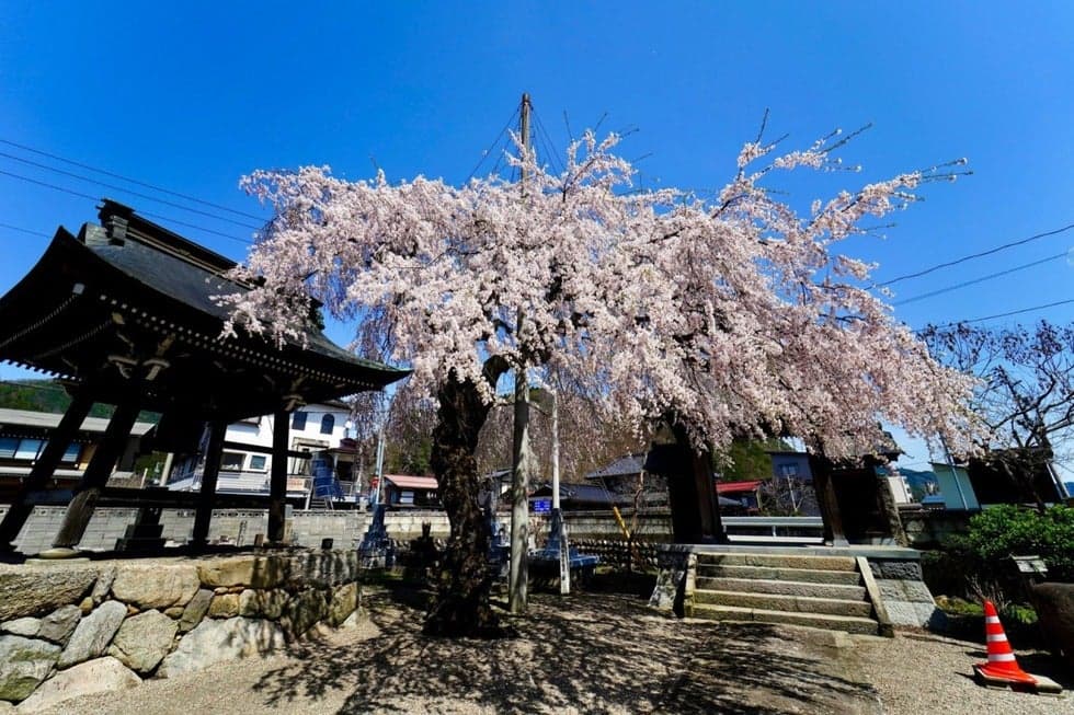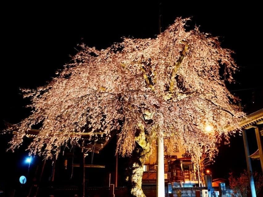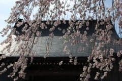 非常に枝形が美しいしだれ桜の古木は、お寺の山門や釣鐘堂に良く似合う。夜はライトアップされており、ピンク色に輝くその姿は荘厳でありながら優しい。見頃は毎年4月下旬。(桜が咲いている時期は毎夜ライトアップされている。)