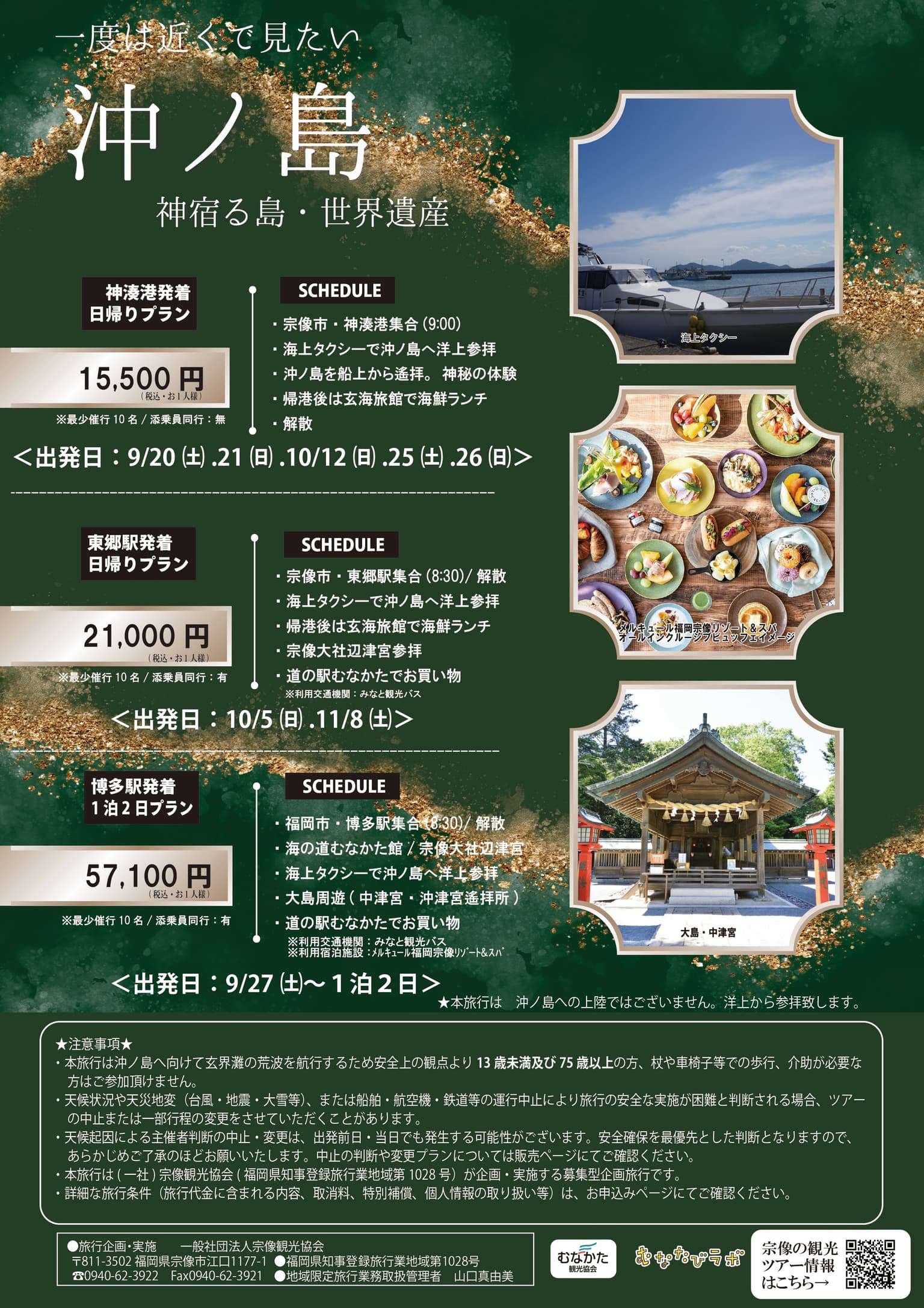 - 本旅行は沖ノ島へ向けて玄界灘の荒波を渡行するため安全上の観点より13歳未満及び75歳以上の方、杖や車椅子、介助が必要な方はご参加頂けません。 天候状況や天災地変(台風・地震・大雪等)、または船舶・航空機・鉄道等の運行中止により旅行の安全な実施が困難と判断される場合、ツアーの中止または一部行程の変更をさせていただくことがあります。 天候起因による主催者判断の中止・変更は、出発前日・当日でも発生する可能性がございます。安全確保を最優先とした判断となりますので、あらかじめご了承のほどお願いいたします。 本旅行は(一社)宗像観光協会(福岡県知事登録旅行業地域第1028号)が企画・実施する募集型企画旅行です。 詳細な旅行条件(旅行代金に含まれる内容、取消料、特別補償、個人情報の取り扱い等)は、お申込みページにてご確認ください。