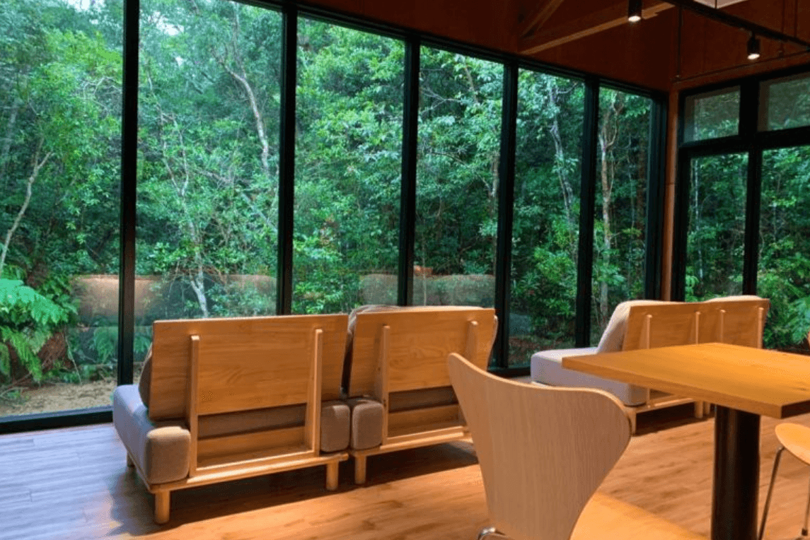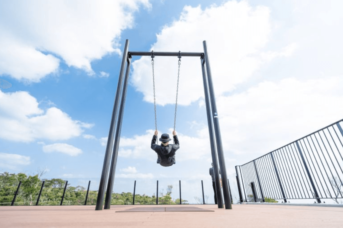 施設は「本体棟」「交流棟」「観察棟」の3つのエリアで構成されており、地元特産品の販売やカフェ、コワーキングスペース、森林散策路、展望ブランコなど、多彩な楽しみ方ができます。特に屋上の大きなブランコは、やんばるの自然を感じながら空を飛ぶような体験ができると話題です。