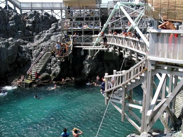 島の北側名組湾沿いにある木製の遊歩道、展望台・とび込み台などもあり透明度抜群の入江では海水浴やダイビングも楽しめます。