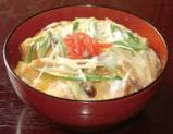 約30年前に、旅館の女将が、肉が苦手なお客様のために作ったのが始まり。登米市の名物油麩をネギやしいたけと一緒に卵でとじたもの。だし汁を吸った油麩は、意外にもヘルシー。今や、ご当地グルメとして有名になりました。