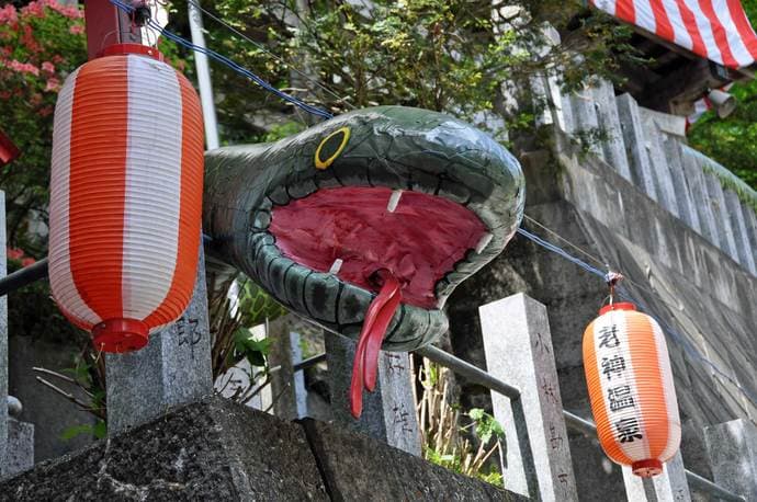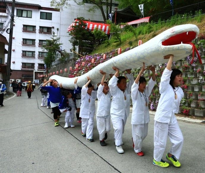 赤城神社境内で厳粛な儀式が終わると威勢の良い男女大勢が大きなへびの形の御輿を担ぎ、かけ声も華やかに温泉街を練り歩きます。