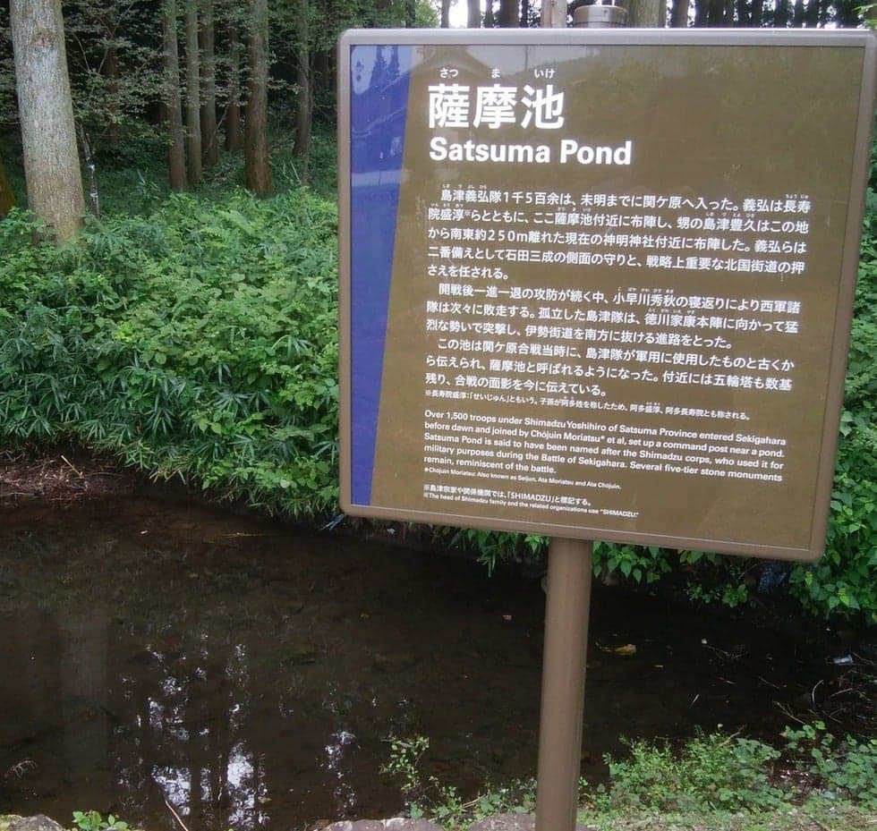 島津義弘隊が布陣した際に軍用として使用した小さな池で、古来より水が枯れたことはないと言われています。関ケ原合戦の勝敗がついた後、島津隊は敵中突破の撤退にて、伊勢街道を走り抜けました。