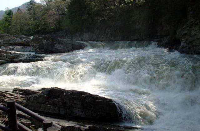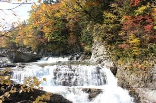 芦別川上流。その名のとおり、三段の奇岩を激しく流れ落ちる「三段滝」。紅葉が美しい。