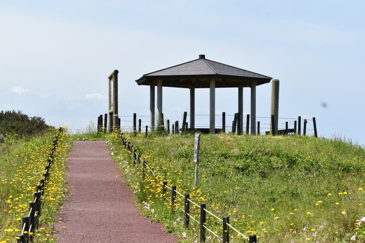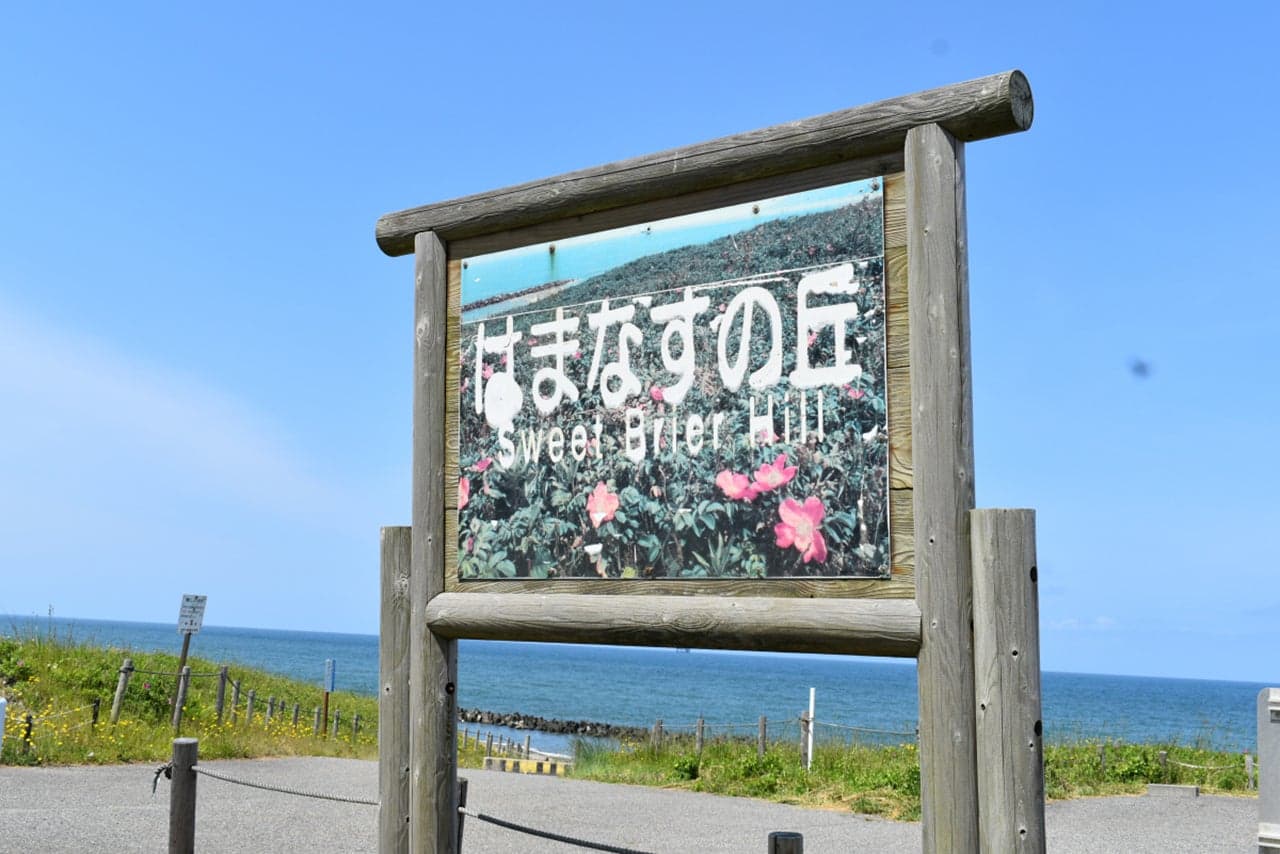 展望台から望むハマナスの群落、佐渡・粟島のパノラマや、風力発電の風車など、空も海も堪能できる素晴らしい眺めです。