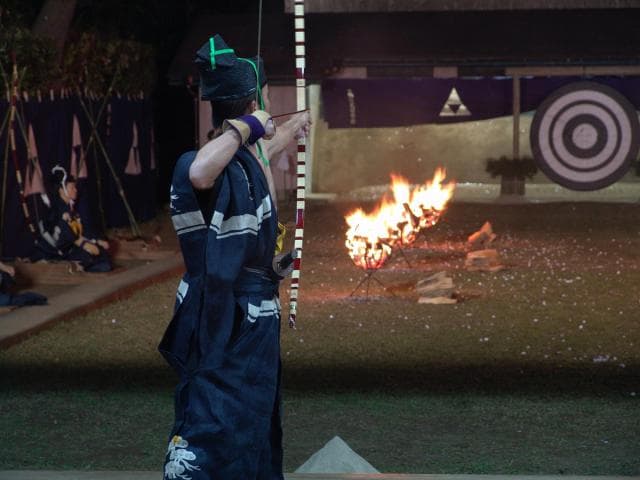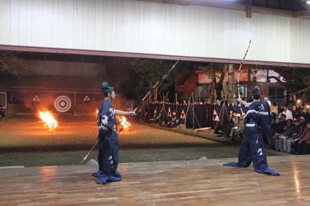 毎年1月11日午後5時から、栖林(せいりん)神社内において36本の矢で直径175cmの大的を射ます。その年の悪魔災難を払い清め、島内の平安と無病息災を祈願する古式ゆかしい行事です。文亀元年(1501年)、武田筑後守光長が宮中の御的始式(おんまとはじめしき)を伝えたのが起源であり、すでに500年以上にわたり受け継がれています。