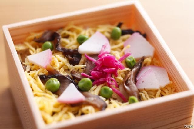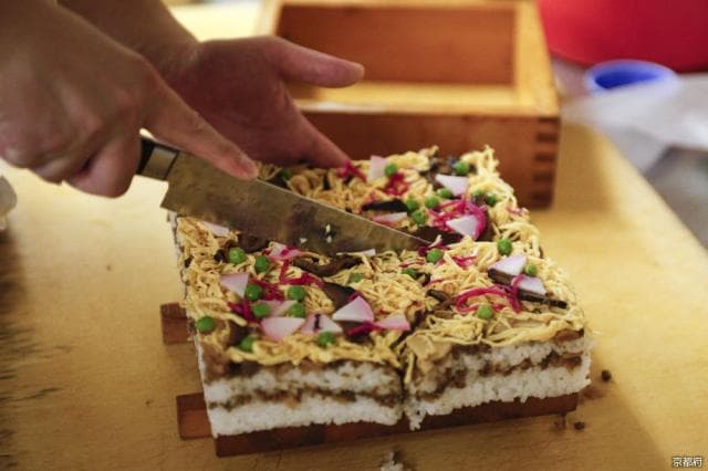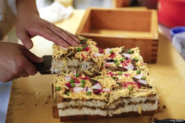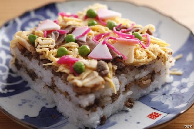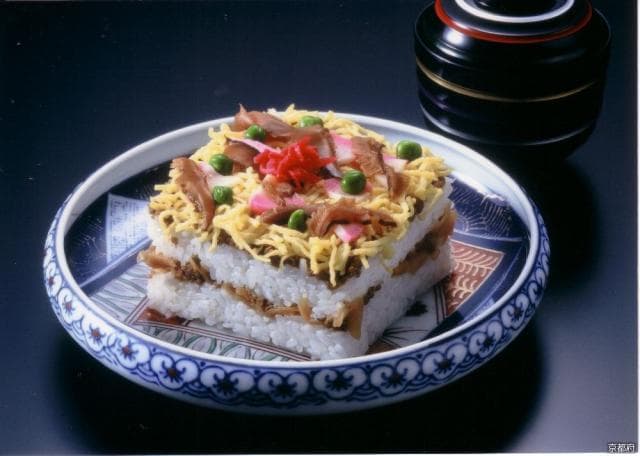 丹後地方のまつりや祝いごとには欠かせない郷土食。“まつぶた”とよばれる長方形の木箱に、おぼろにしたさば、まつたけ、栗、しめじ、わかめなどを段状に重ねて詰め、食べるときは木べらで切り取って分ける。