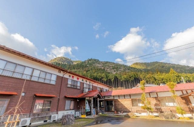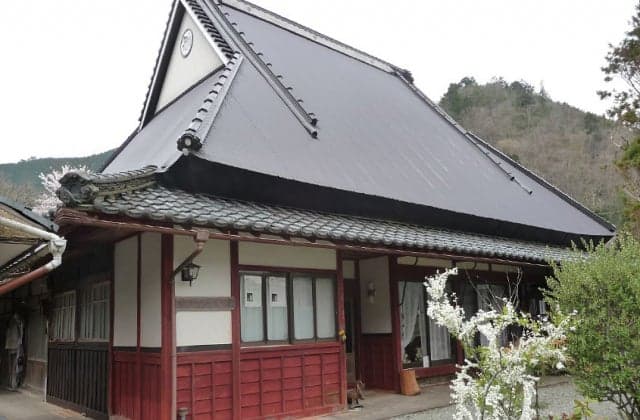 庄屋の住まいだった古民家を改装した宿で、10人が座れる囲炉裏がある。