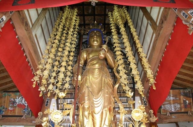 名僧、是山泰覚が開基した長谷寺の二重屋根垂木造りの塔におさまる2丈6尺(約9m)の十一面観世音菩薩像。全身が金色にさん然と輝き、奈良、桜井の長谷寺、鎌倉の長谷寺とともに、日本三大長谷観音の1つとなっている。又、赤田の大仏の祭典として、8月22日に数多くの獅子舞が参加して、豊作と家内安全を祈願する神仏混合の珍しいお祭りがある。