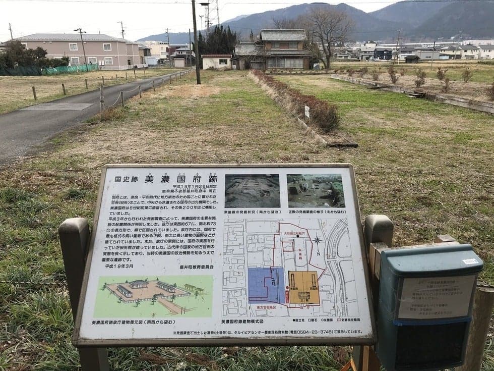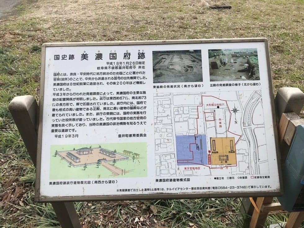 大化改新(645年)によって、全国に国府がつくられ美濃国では府中地区一帯にあったといわれています。7世紀の終わりから8世紀初めにかけて、大和朝廷は律令政治の完成をめざしていました。全国を国と郡に分け。それぞれに国府(こくふ)、郡衙(ぐんが)などの役所を置きました。岐阜県は、当時 美濃国と飛騨国に分けられており、美濃国の役所としての「美濃国府」がおかれ、それが、現在の垂井町府中にあったことが発掘調査によってわかってきました。調査で中心地は、御旅神社付近と推定され当時使われた布目瓦や土器の破片・柱跡が見つかっています。