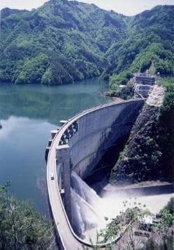 洪水調節、河川環境の保全、灌漑、発電を目的として昭和44年に完成したアーチ式ダム。秋には、湖面に映る紅葉が最高。