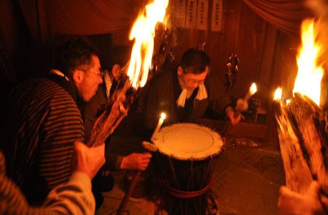 氏子たちは農作業の衣服のまま、灯篭の薄明かりの下で豊年の予祝と作占いの田遊びを行います。例祭当日は女人禁制であり、神事の一切を肉親にさえも他言無用の不文律が今日も固く守られています。古い神事の形を良く残しているため民俗学的にも貴重なものです。毎年同日(1月3日)開催。