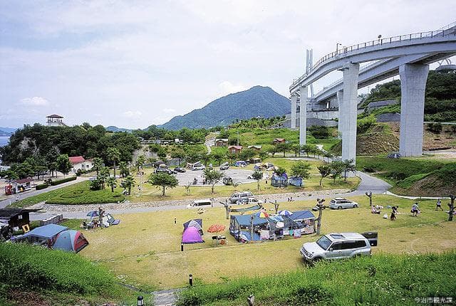 多々羅大橋のたもとにあるキャンプ場。目の前には広い海浜があり、シャワー、水洗トイレ、炊事棟などの設備も整っています。
