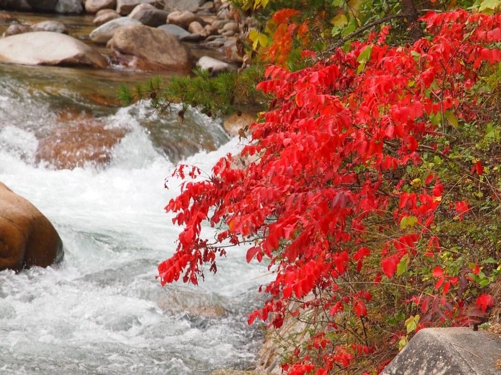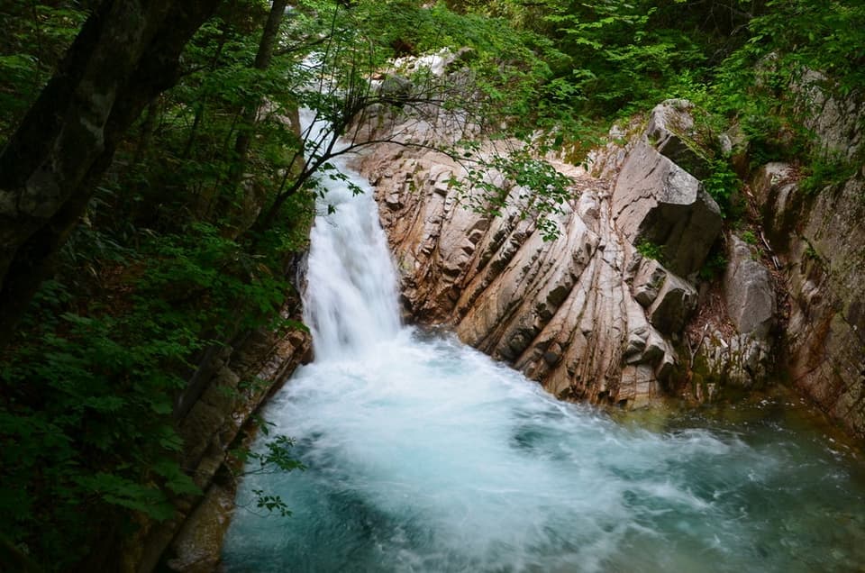 北アルプスのふもとにある中房渓谷は、春は新緑、秋は紅葉が美しい。