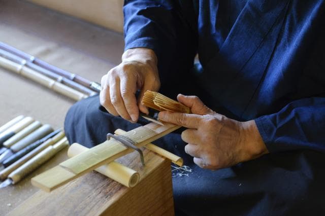 いま、この地で生産される茶筌(せん)は形状種類及び竹の種類によって60種余を数える。淡(は)竹、黒竹、煤(すす)竹などの強い繊維を利用し、各流儀、用途に沿って60~120本ぐらいの穂先をいちいち小刀等で作るが、その製法順としては大旨