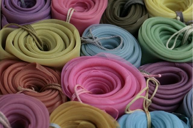 「紅花染」は摘み取った紅花を昔ながらの手法で「紅餅」へと加工し、その色素を用いて丁寧に染め上げます。紅の量により、さまざまな美しい色が表現できます。「草木染め」は、天然の素材だけを使用した自然味あふれる風合いが魅力です。