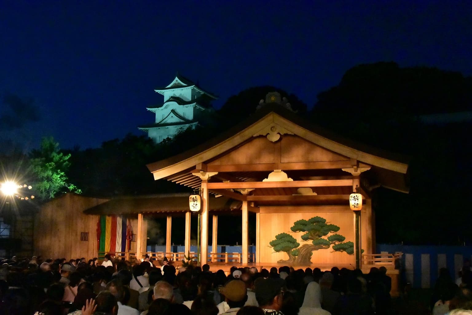 兵庫県明石市の「明石薪能」は、古来より多くの人に受け継がれてきた伝統文化を今に伝える催しとして開催されます。ライトアップされた明石城を借景に、特設能舞台上で狂言や能が披露されます。
