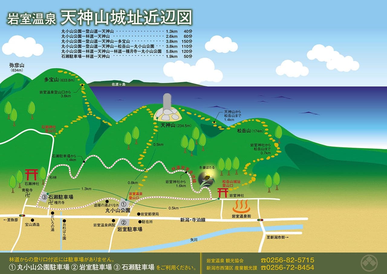 天神山城は、西蒲区石瀬と岩室温泉の境にそびえている海抜234mの堅固な山城で、中世の城郭跡がほぼ完全な姿が残っています。南北に走る尾根には大小7本の空壕が配され、その頂上に本丸があり、枯渇しない水源、瓢箪池があります。