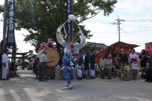 農作物と海苔の豊作を祈る例祭。御神輿が浮立のウチコ(装束をまとった者)を従え、笛を吹き、太鼓、鉦を打ち鳴らしながら町内を練り歩く。神社境内では天衝舞浮立が奉納される。参道には露店が軒を並べたくさんの人でにぎわう。