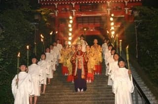 日本三大温泉祭の一つとして知られ、また深夜の奇祭として賑います。最大の行事は2日夜の「分湯の儀」で町民より厳選された女神が巫女を従えて祭場に現われます。「温泉の繁栄を祈り分湯する」そのさまは遠く平安の昔に呼び戻されます。