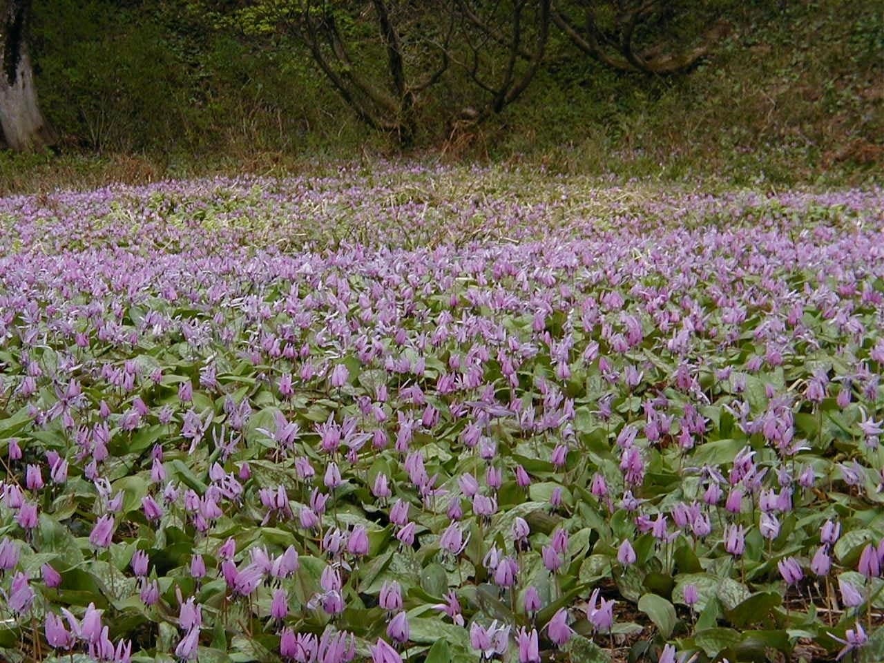 標高634mの山麓~山頂まで群生地が点在し、イチゲ、エンゴサク、イワカガミ、ショウジョウバカマ、イカリソウなども同じ頃に見ることが出来ます。
