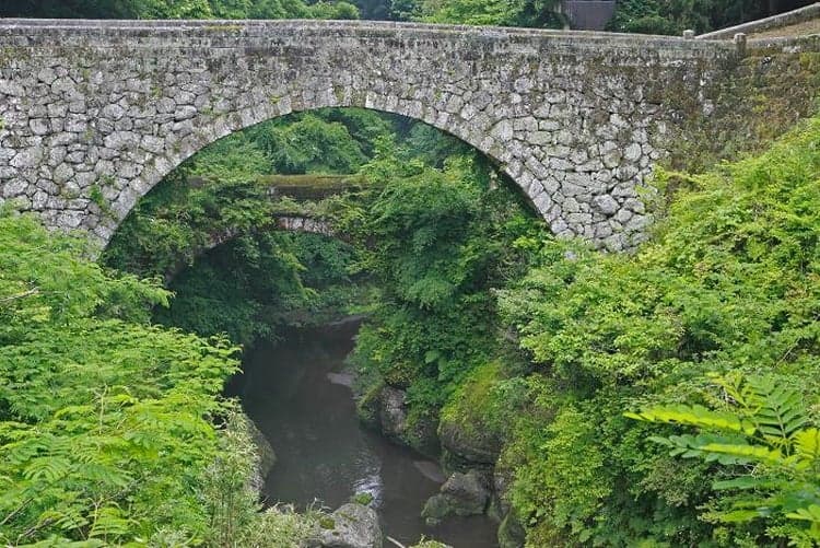 嘉永2年(1849年)に造られた岩戸橋(いわとばし)はアーチ上の石橋で、長さ28m・高さ18mの威風堂々とした姿は、江戸時代の架橋としては類を見ない秀麗さです。見事な石組みは、当時の架橋技術の高さがうかがえます。