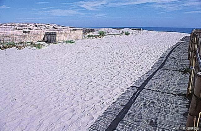 天竜川から流出する土砂が沿岸潮流にのり、「遠州の空っ風」と呼ばれる強い西風によって内陸に運ばれて形成された砂丘。冬には砂の表面に風紋が広がる情景が美しい。夏には地元の家族連れなど、貝殻拾い、砂浜遊びに訪れる姿も見られる。