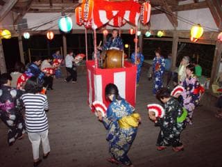 阪本天神社の盆踊りは、特に山村らしい風情を残すことから「阪本踊り」と呼ばれ、県無形民俗文化財に指定されています。中でも「政吉踊り」と呼ばれる踊りはこの地域にのみ伝えられてきたものです。 由来は、村の人々の罪を一身に引き受けて身代わりとなり、村の危機を救ったという政吉の遺言により、政吉を弔うために踊り続けられているものです。毎年4月29日に踊られています。