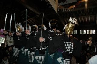 養老年間に伝承された舞楽といわれ地元大里・小豆沢・長嶺・谷内の四地区の斎戒沐谷をした能衆が,正月二日の午前零時ごろから祭場に含流し,分担した舞楽を奉納する。1952年国重要無形民俗文化財、2009年ユネスコ無形文化遺産に登録された。