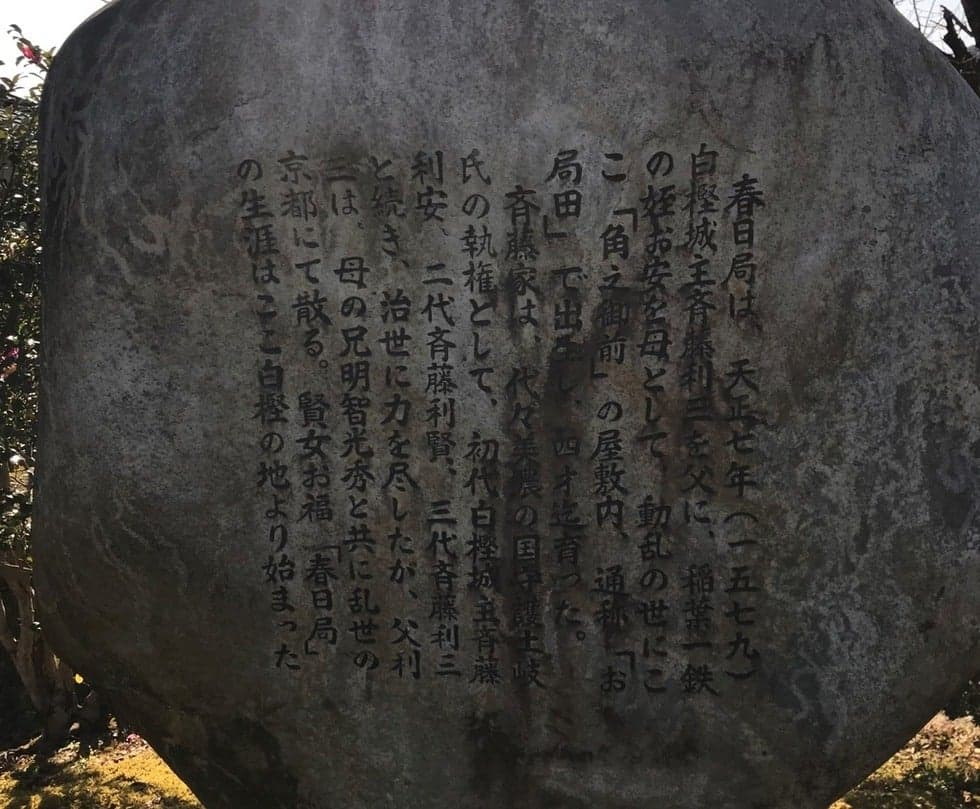 春日局公園徳川家光 公の乳母として、大奥の基盤を整えたと知られている「春日局(= お福)」母の兄は、「明智光秀」公 ・・・ ?とも言われています。父の「斎藤利三」公は、「明智光秀」公の重臣として本能寺の変、山崎の合戦で行動を共にした白樫城主(揖斐川町)。明智家と縁戚関係にあったともいわれており、光秀公を支えた勇将のひとり。「長宗我部元親」公とも縁戚にあったことから父の立場を考えると日本史上最大の謎「本能寺の変」の一因になったかもしれません。(諸説あり)