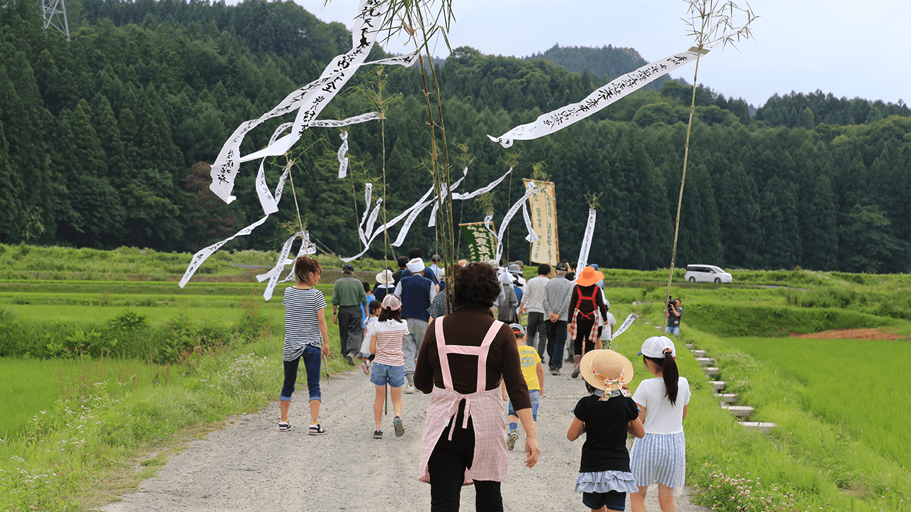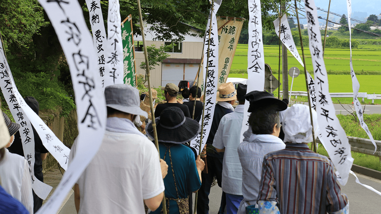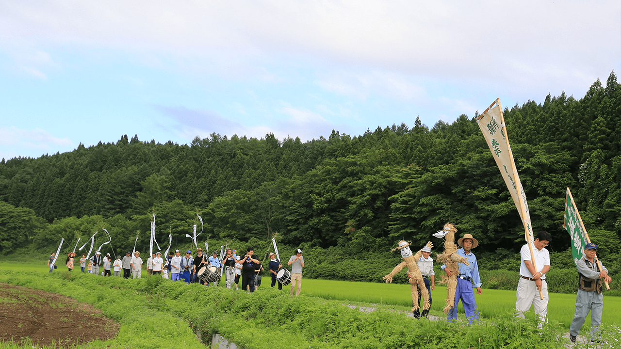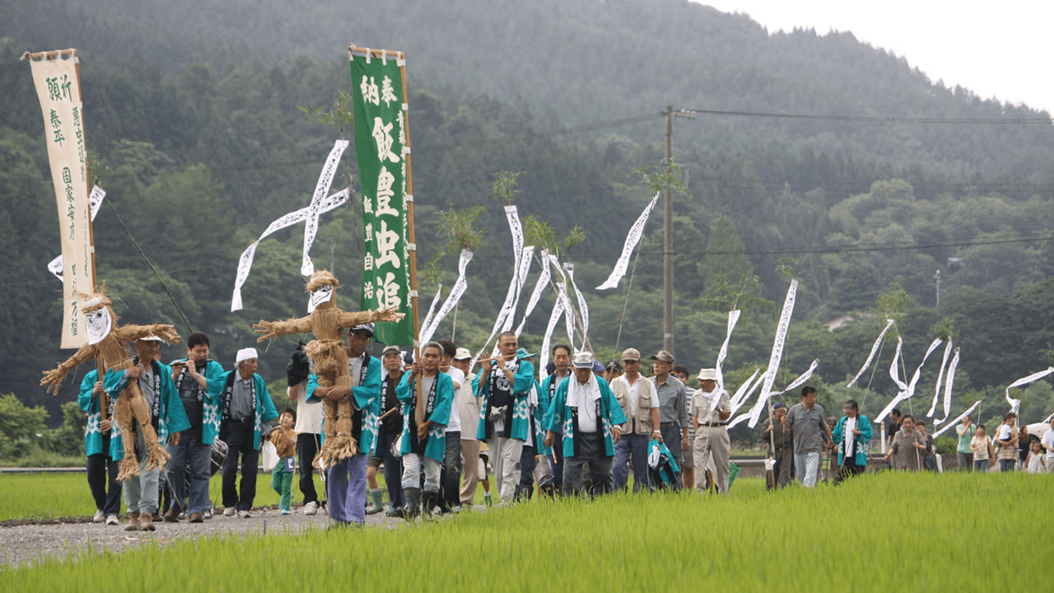 田子町の飯豊地区で行われてきた、県無形民俗文化財に指定される伝統的な行事です。農薬の普及していない時代、田畑の害虫を駆除し、豊作を祈願して行なわれてきました。男女一対の大きなムギカラ人形を担いで地区を練り歩き、紙旗を振りながら進みます。最後は、村境に人形を立て、行事は締めくくれます。