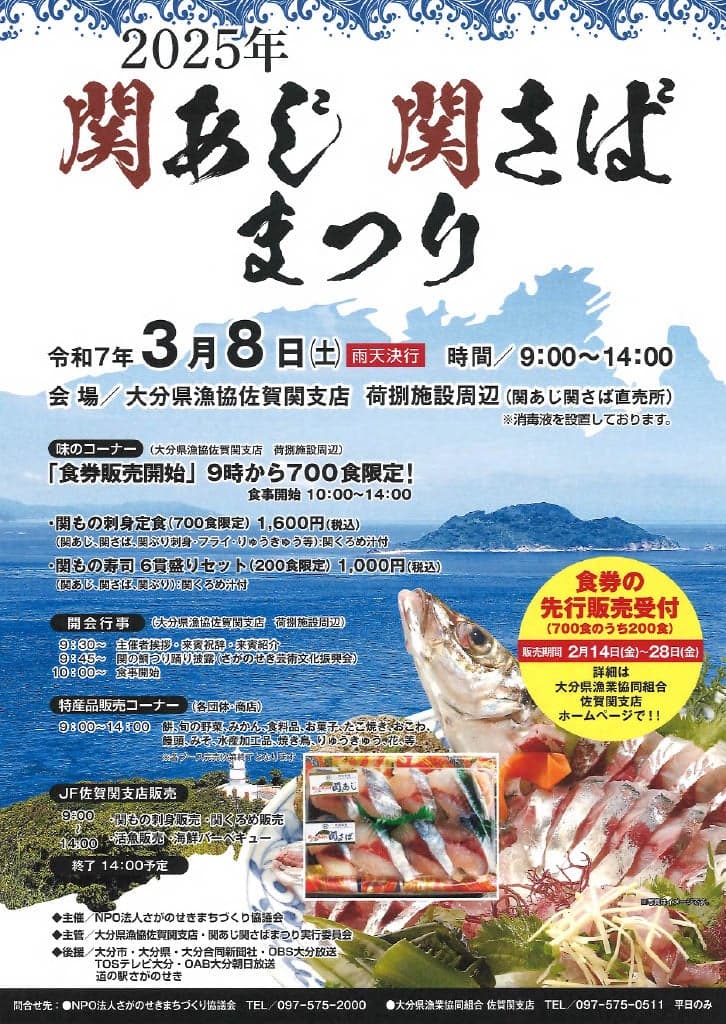 新鮮な「関もの刺身(関あじ・関さば・関ぶり)定食」700食(内200食先行販売有り、詳細はJF佐賀関支店ホームページ)、「関もの寿司6貫セット」200食(食券は当日現地で販売)が味わえる見逃せないイベントです。