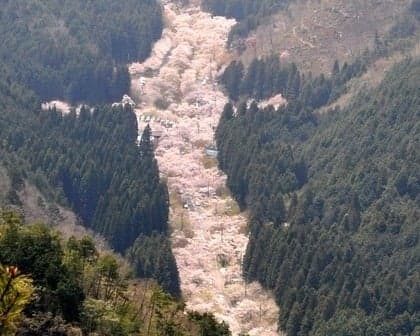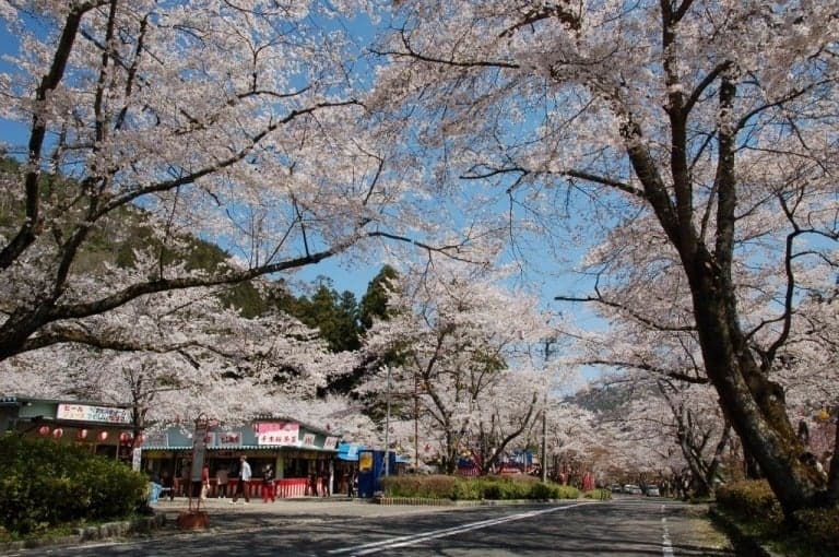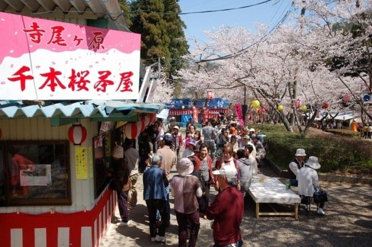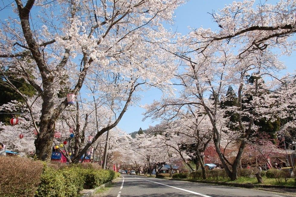 毎年4月中旬に満開を迎える寺尾ヶ原千本桜公園の約1000本の桜並木は、全長2kmにわたる見事な「桜のトンネル」となります。シーズン中には並木沿いに「ぼんぼり」が飾られ、たくさんの屋台でにぎわう。夜間にはライトアップもあり、幻想的です。飛騨・美濃さくら33選に選ばれており、例年4月上旬~中旬が見ごろ。