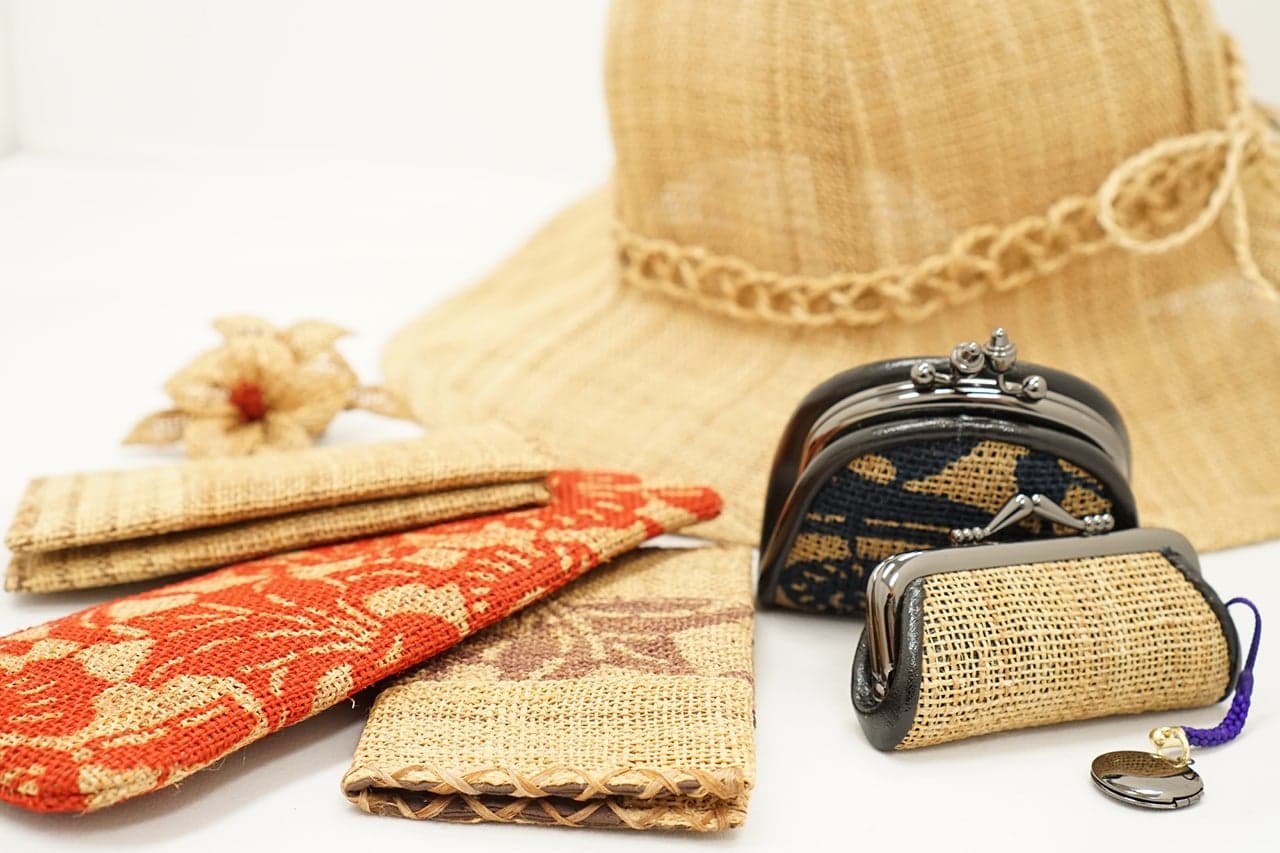 原始的な手作業で1年も費やされて織りあげたしな布やしな糸を利用し、ハンドバック、ブローチや帽子など、手づくりで作られた民芸品。