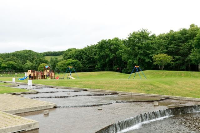 公園内には子どもに人気の大型遊具が複数完備されているほか、安全に水遊びができる親水池、キャンプ場(有料)、バーベキューハウスがあります。この他にも幕別町発祥のスポーツが体験できる「パークゴルフ場」があり、一日中楽しむことができます。