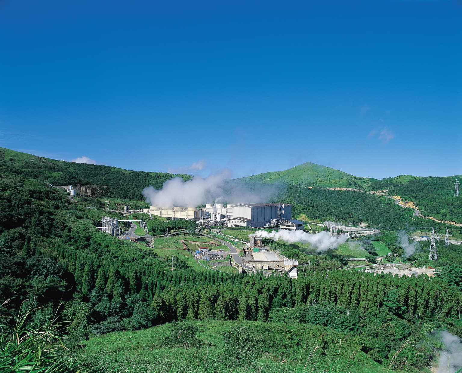 くじゅう連山や阿蘇くじゅう国定公園の山々に囲まれ、火山による地熱エネルギーに恵まれた立地に位置する「八丁原地熱発電所」。日本最大の地熱発電所で、1号機と2号機を合わせて総出力は11万kWにおよびます。