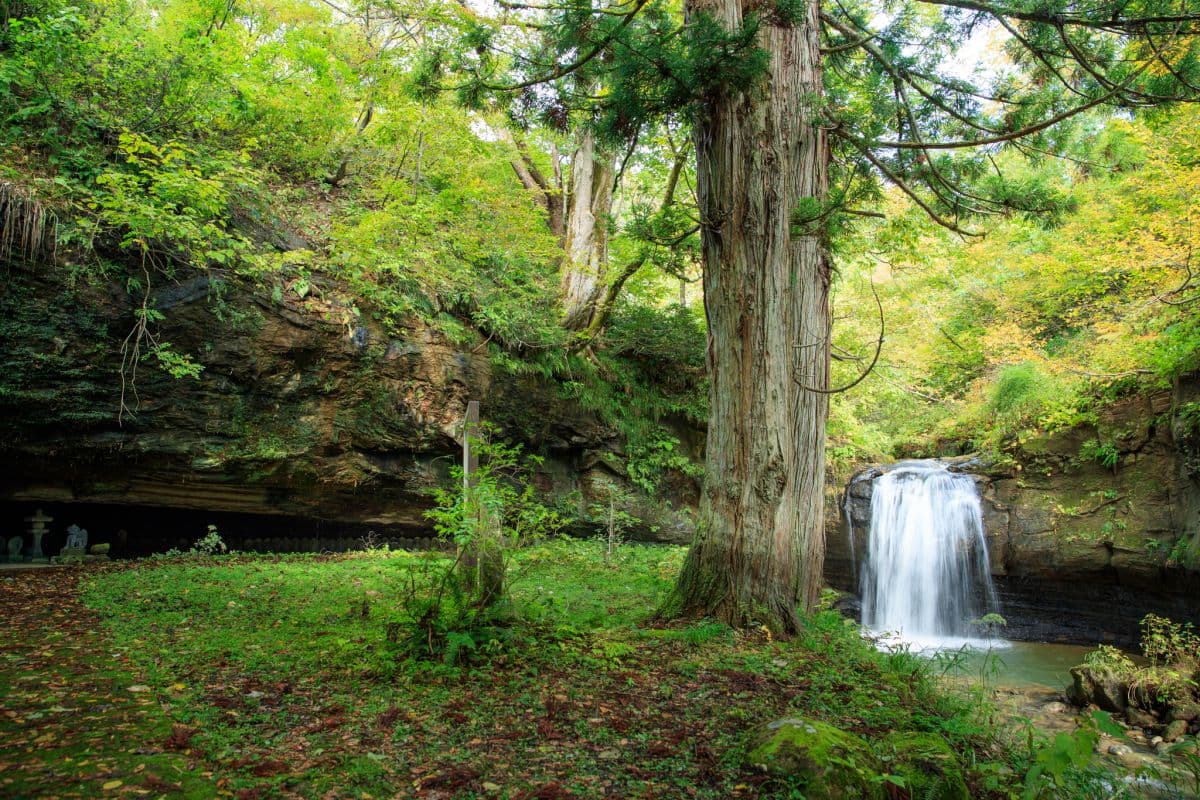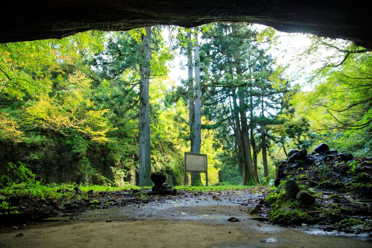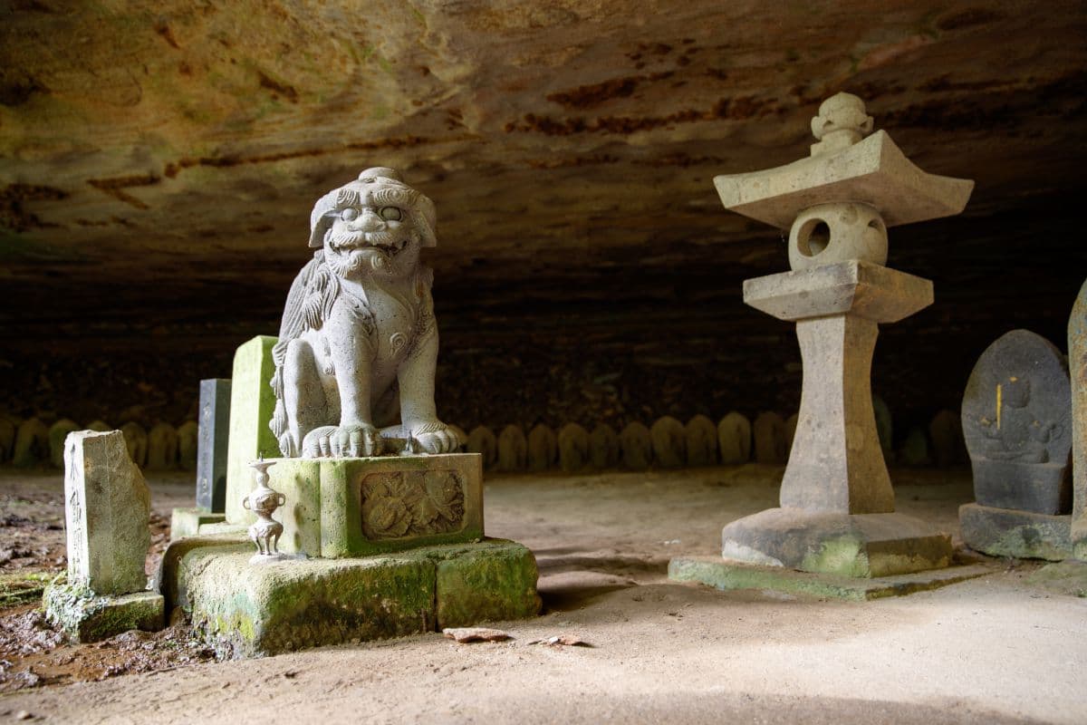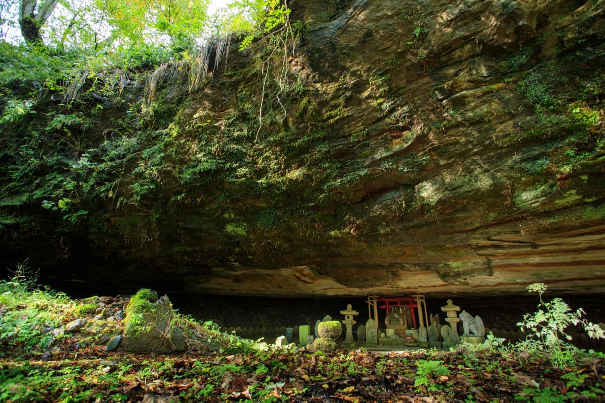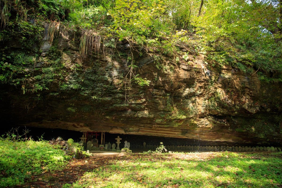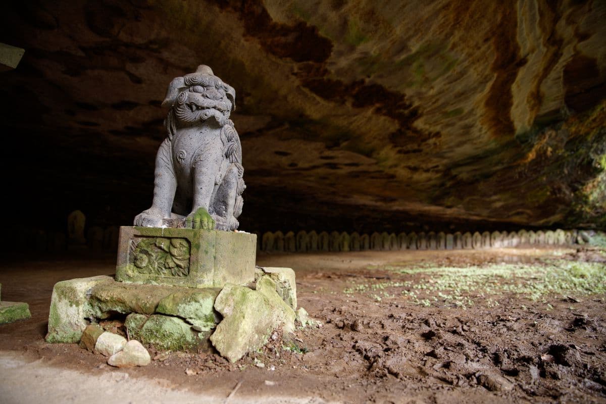 間口約30m、奥行き約13m、高さ平均約2mの半月形水成洞窟の中に不動尊がまつられ、百数十体からの石仏が安置されています。