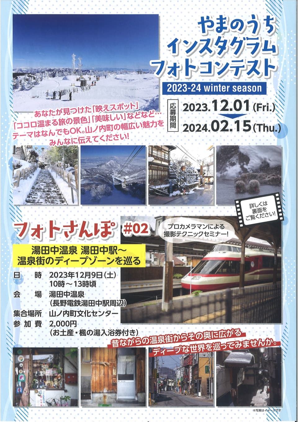 (2)写真のキャプションに次のハッシュタグをつけてください。「#わたしのやまのうち」「#やまのうちインスタフォトコン2023」撮影場所のハッシュタグ「#志賀高原・#湯田中渋温泉郷・#北志賀高原」のいずれか