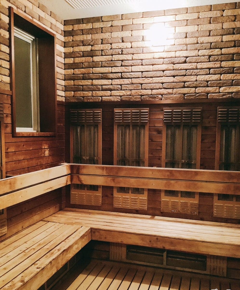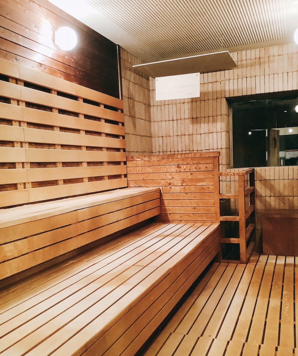 女性サウナは、壁面にスッキリついた遠赤外線ヒーターがポイント。レンガ調のタイル作りで落ちついた照明の中、蒸されます。