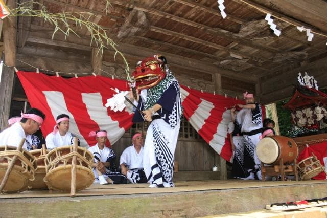 君津市の大戸見にある稲荷神社の祭礼に、神楽殿で奉納されます。 この神楽は林治流儀といわれ、2人立ちの獅子を中心に、笛2人、大太鼓1人、小太鼓2人、すり鉦2人で構成されます。神楽の舞は、1人で歩けない幼児期を表現する「おのう」、「前かがり」に始まり、踊り手が幣(へい)を持って舞う「おん幣の舞」、そして「鈴の舞」、更には少年期を表現するという「くるい」、最後に「おくり」を演じて終わります。 大戸見の神楽は、楽が進むにつれて人が段々成長しているものだといわれています。また、囃子には「ばかばやし」「ごばやし」「ぎりんばやし」「あまだれ」が伝承されています。