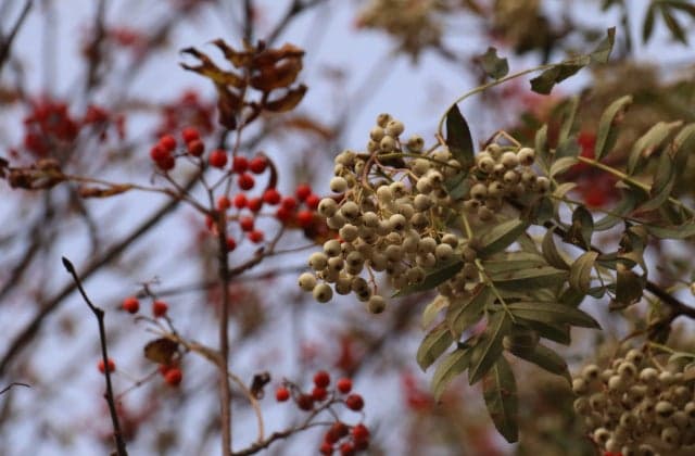 秋から冬にかけて純白の実をたくさん実らせ、隣の赤実のナナカマドと紅白で縁起ものとして楽しませてくれます。