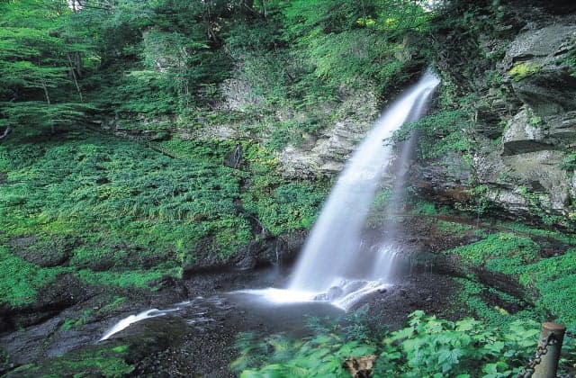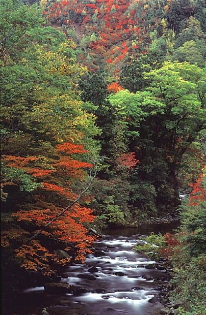 湯ノ小屋温泉から入口まで徒歩80分。俳人「水原秋桜子」が名付けた大小11の滝がある紅葉の美しい渓谷です。
