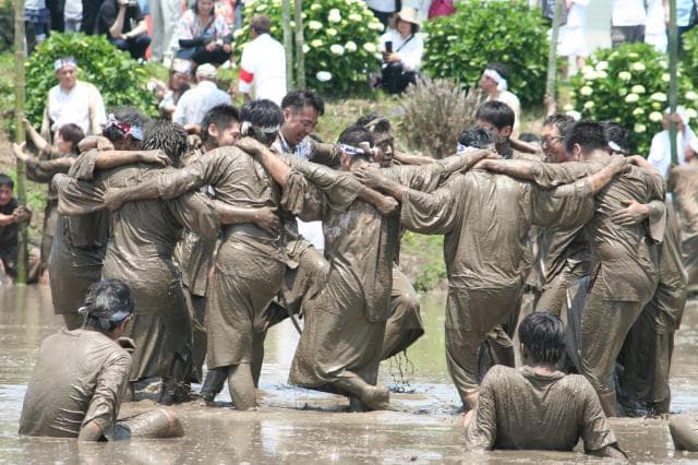 「せっぺとべ」は文禄4年(約400年前)から日吉地域に伝わるお田植え祭りです。若い衆が田の中で円陣を組み、酒を飲み、唄を歌いながら勢いよく飛び跳ねます。この祭りは土をこねる足踏み耕の意味と害虫を踏み潰す意味があり、泥にまみれて今年一年の豊作を祈願します。当日は地域住民や子供会による棒踊り、虚無僧踊りなども奉納され、まちは終日活気に包まれます。
