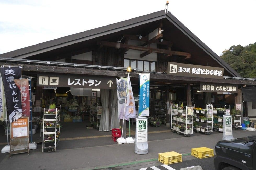 「日本で一番きれいなトイレの道の駅」「日本で一番親切な道の駅」をスローガンに掲げ、スタッフが一丸となってお客さまのおもてなしに努めています。ホテル「フェアフィールド・バイ・マリオット・岐阜美濃」が隣接。レンタサイクルもあるため、美濃にわか茶屋を拠点として美濃の町並みを巡る観光利用もおすすめです。産直販売スペースが広く、さまざまな朝どれ野菜が豊富に並ぶ。とうもろこし、スイカ、にんにくはイベントも開催しており、毎年多くの人で賑わいます。レストランでは地元の老舗料亭がプロデュースした料理がいただけます。オリジナルメニュー「鮎にんめん」は、昭和30年頃まで和紙職人が食べていたという美濃ならではのグルメ。鮎をたっぷり使った出汁が香り豊かで、鮎独特の風味が生きています。ほかに「鮎カツ丼」も人気です。季節メニューはシーズンごとに3~7品がラインナップ。春は桜ざるそばや和さくらパフェ、山菜を使った天ぷら・ちらし・釜飯など。夏は鮎メニューのほか、ぶっかけうどん・そばや鮎天おろしも隠れた人気メニュー。秋は松茸釜めしや土瓶蒸しなど、山の恵みを存分に味わえます。冬は陶板焼き、味噌煮込みなど、あったかメニューが登場します。また、自転車を貸し出すサイクルステーションが設置され、うだつの上がる町並みや長良川沿いの川湊灯台、国重要文化財の旧美濃橋などへのサイクリングが気軽に楽しめます。貸し出し用の自転車は、こども用4台を含む17台を用意。オススメは、計5台ある電動アシスト自転車です。(電話予約可)