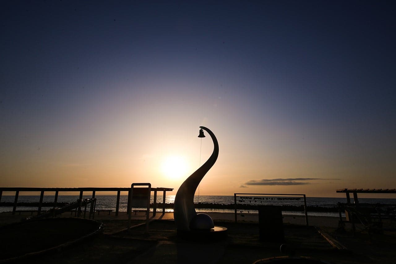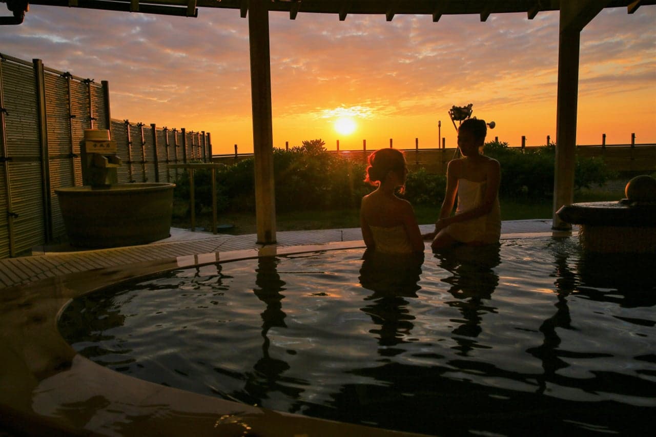 日本海の夕日を眺めて、温泉に癒される