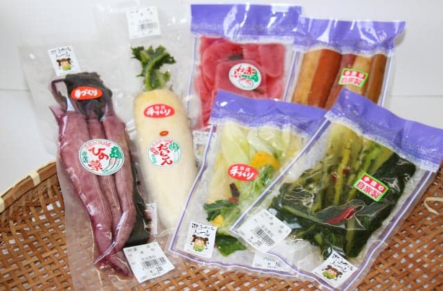 地元で丹誠込めて育てられた新鮮な野菜の漬物です。昔ながらの続く利の味が昔ながらの手づくりの味が人気です。日の菜、カブラ、みょうが、大根など。