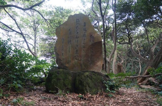真鶴岬の突端の高台に建ち、碑文は晶子の流れるような美しい筆跡が陰刻されています。昭和7年1月2日初めて真鶴の駅頭に立ち、水彩画家三宅克己の案内で半島を巡り、その夜三宅氏のお宅で歌会を開きました。この時「わが立てる…」を始め、数種の短歌を歌ったと「冬柏」や「横浜貿易新報」に発表しています。